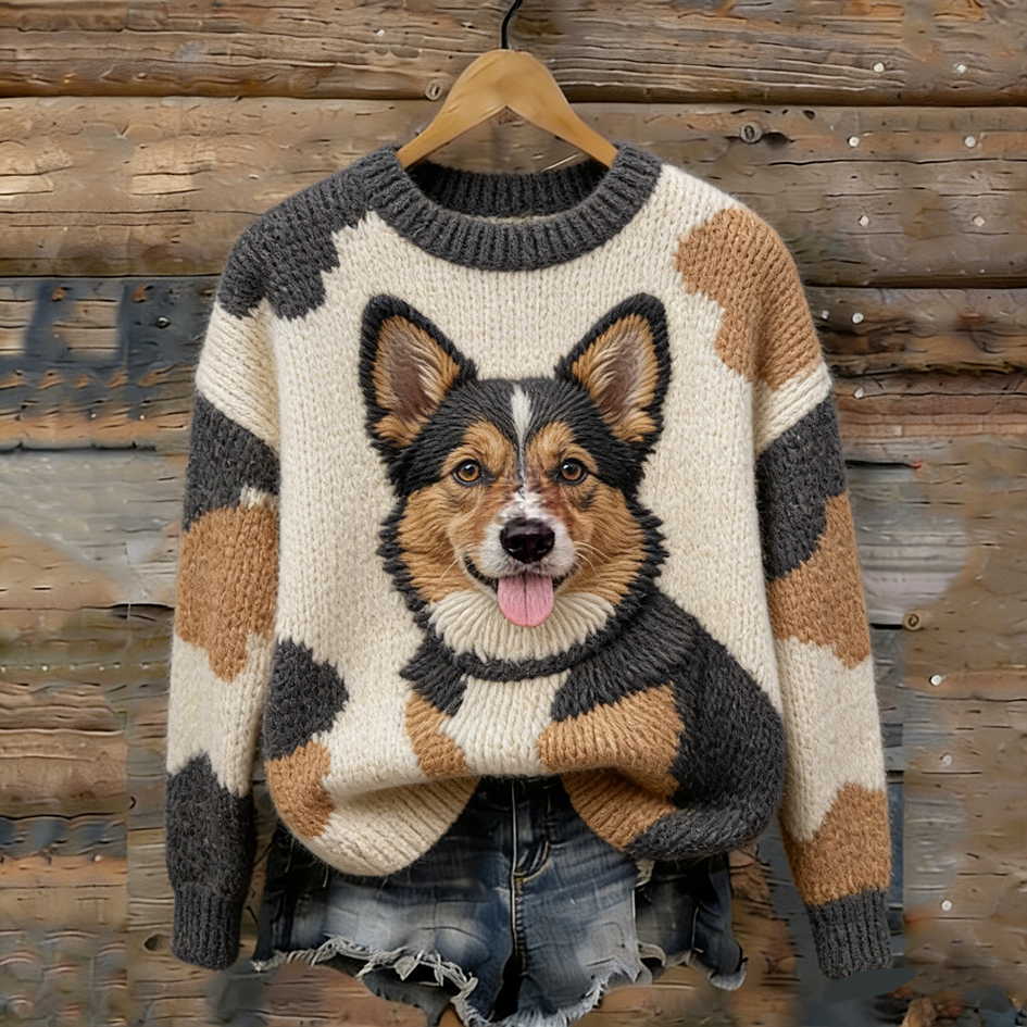 Retro Cute Dog Pattern Round Neck Sweater