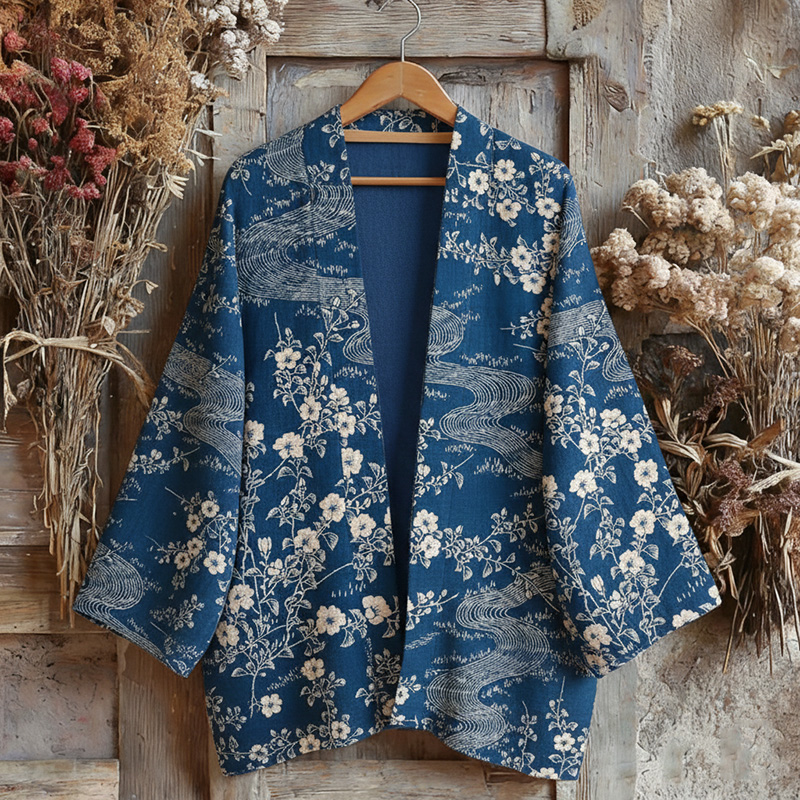 Retro Japanese Traditional Sashiko With Floral Art Print Cotton And Linen Blend Kimono Cardigan