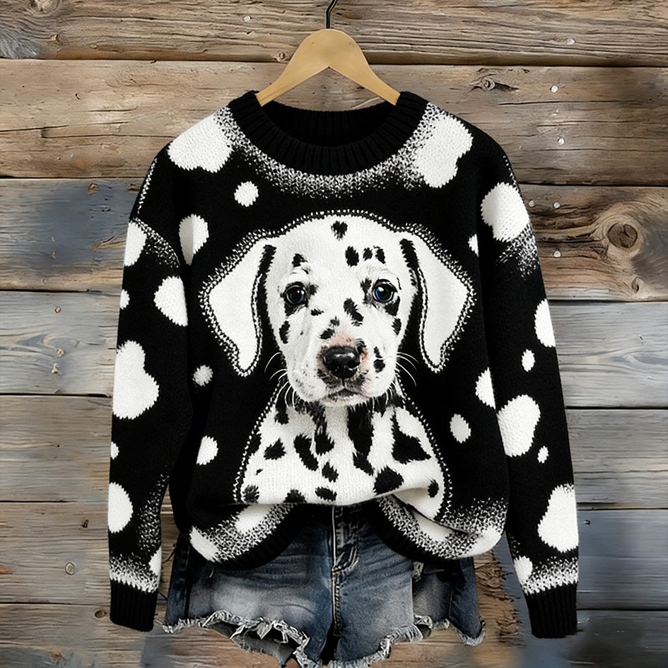 Spot Dog Pattern Printed Women's Round Neck Sweater