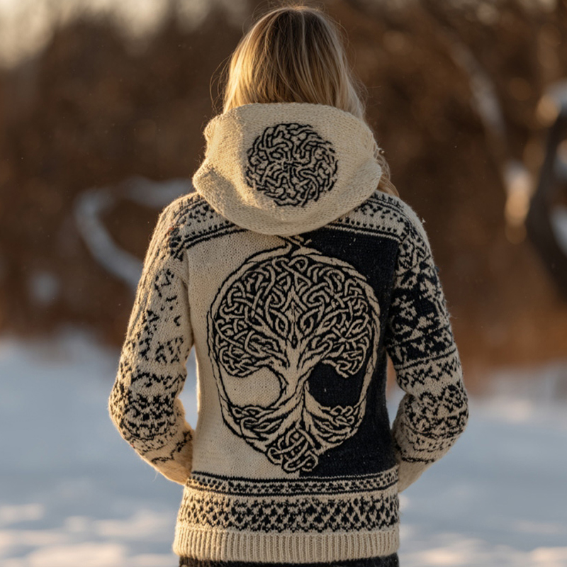 Women's Retro Celtic Tree Of Life Pattern Comfortable Color-blocked Hooded Sweater