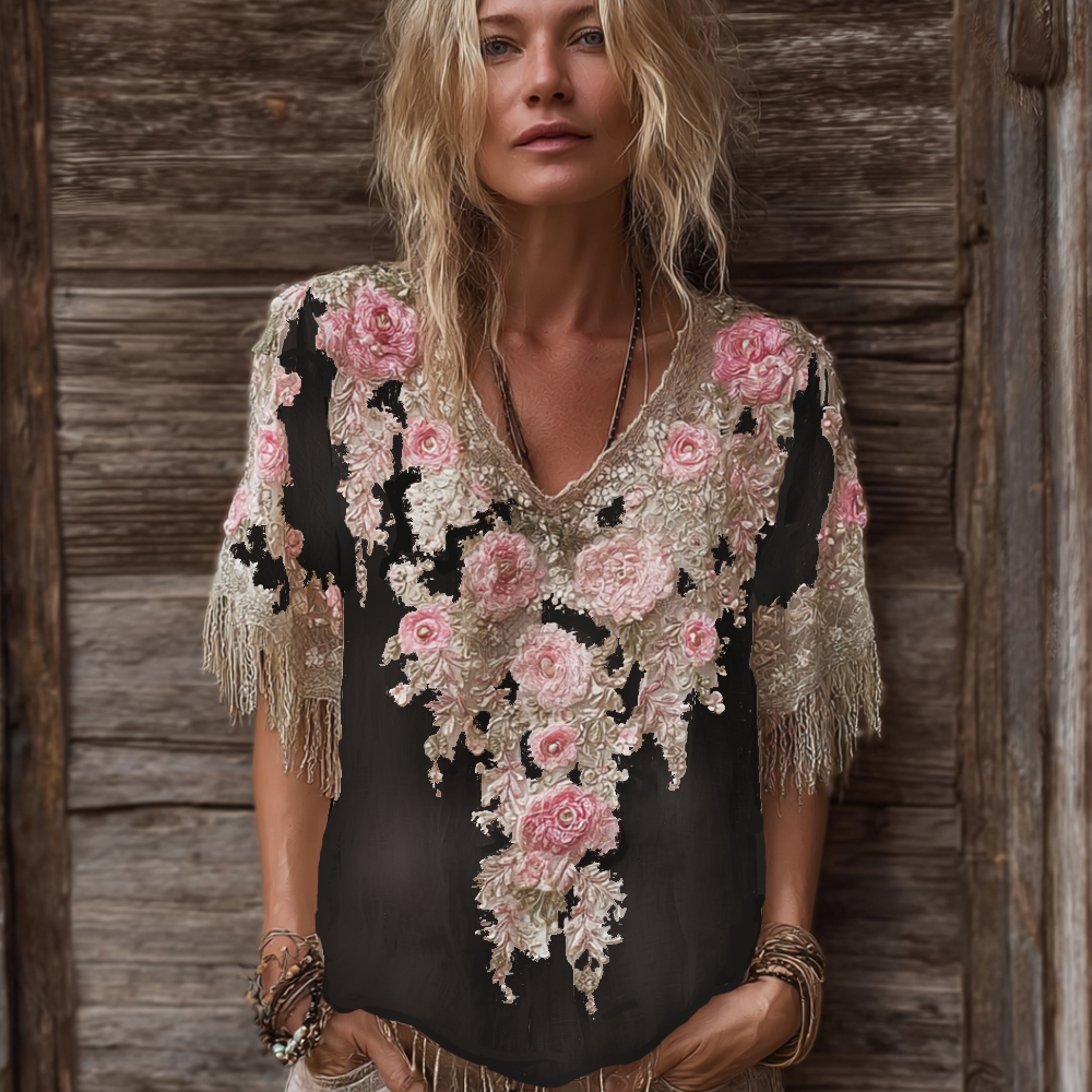 Women's Rose Flower V-neck Vintage Linen Short-sleeve Shirt