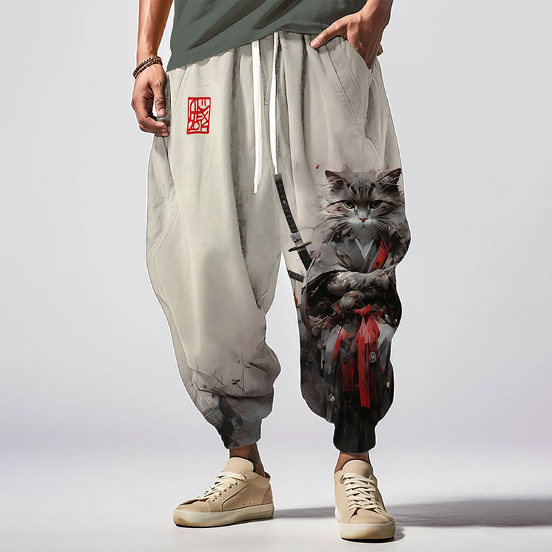 Vintage Kimono Cat Warrior Japanese Art Print Pattern Casual Loose Drawstring Waist Sweatpants
