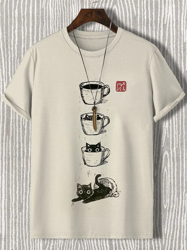 Men's Cat Coffee Mug Japanese Art Painting Print Comfortable T-Shirt