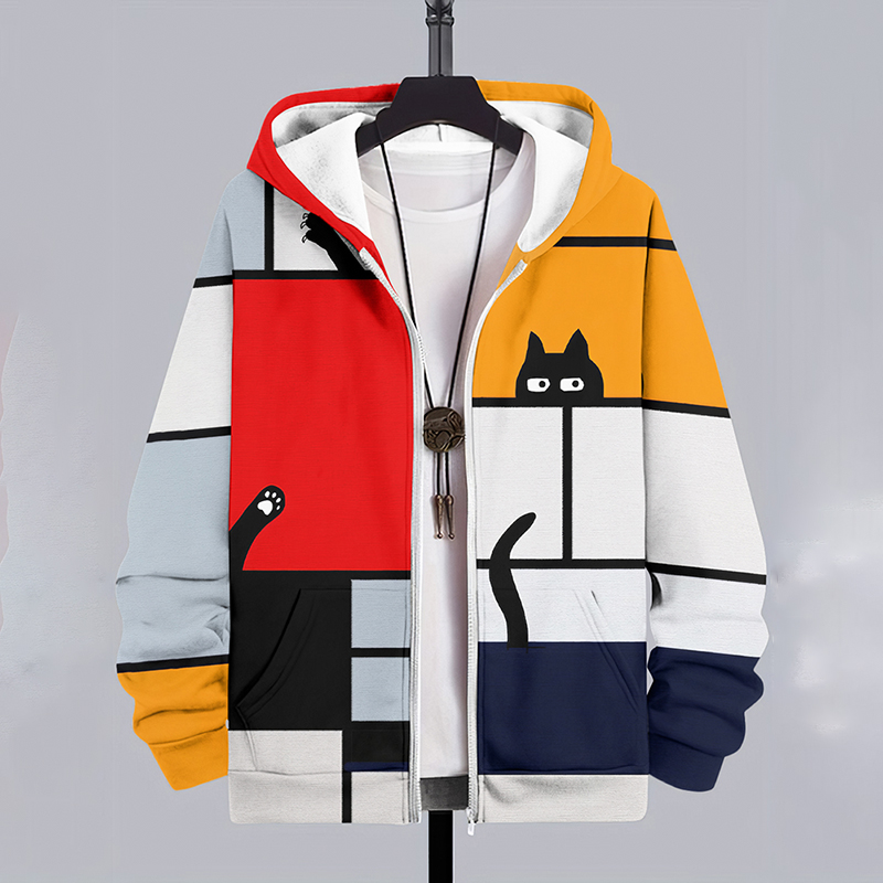 Vintage Colorblock Mondrian Cat Print Casual Zip Hoodie