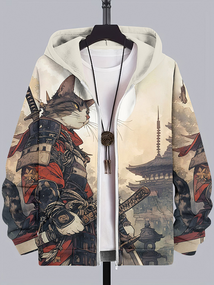Men's Cat Warrior Guard With Knife Art Print Casual Hooded Zip Up Jacket