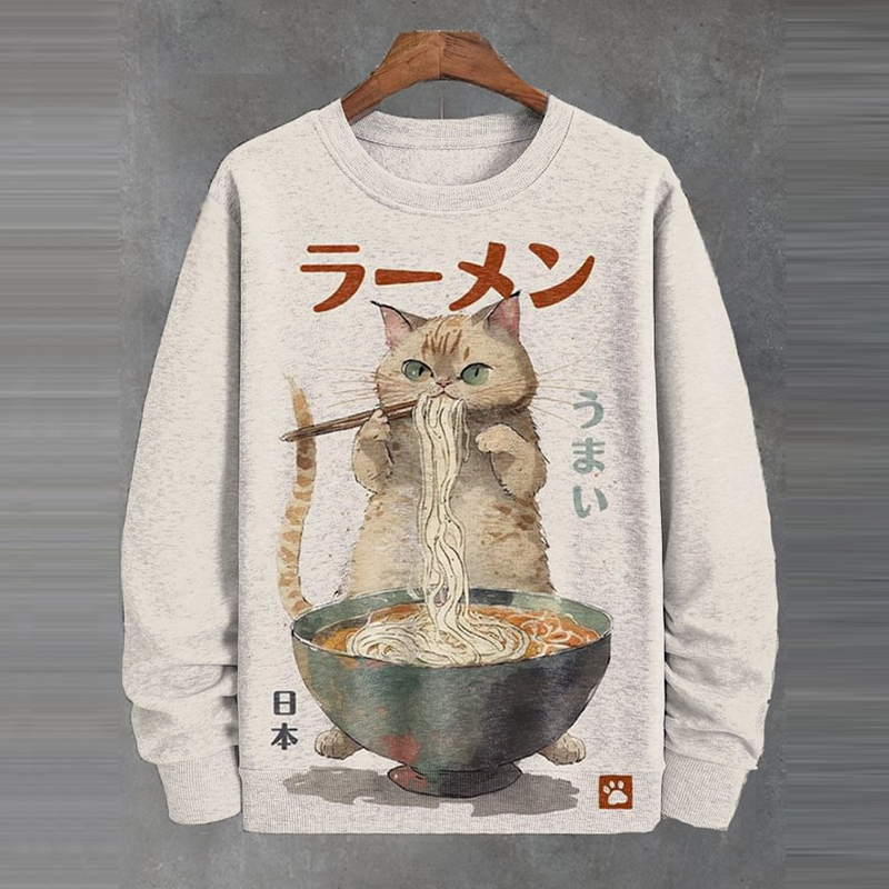 Men's Japanese Fun Ramen Cat Print Casual Sweatshirt