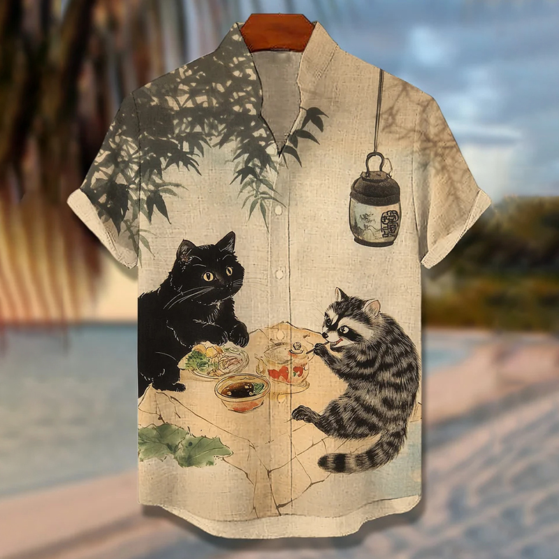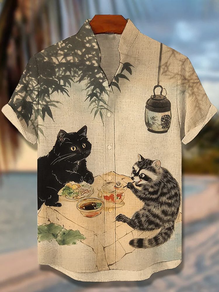Men's A Black Cat And A Raccoon Enjoying A Japanese Meal Print Short Sleeve Shirt