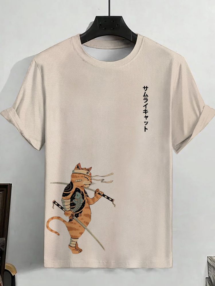 Men's Japanese Samurai Cat Art Print Casual T-Shirt
