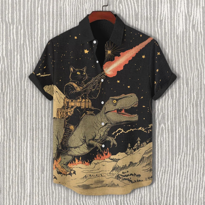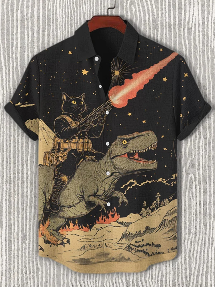 Men's Black Cat Soldier And Dinosaur Art Print Casual Shirt