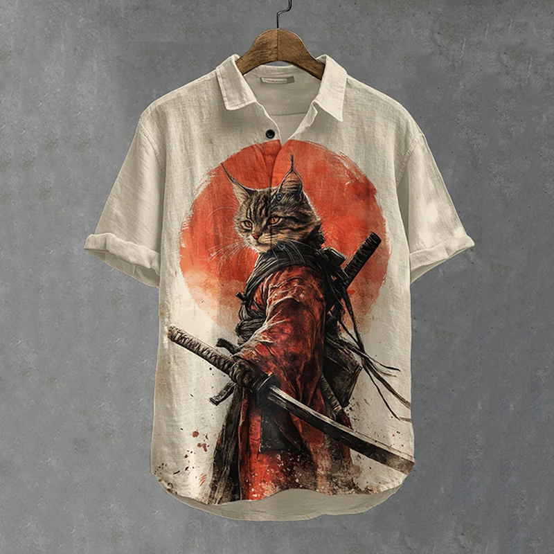 Men's Japanese Warrior Cats Art Linen Blend Casual Shirt