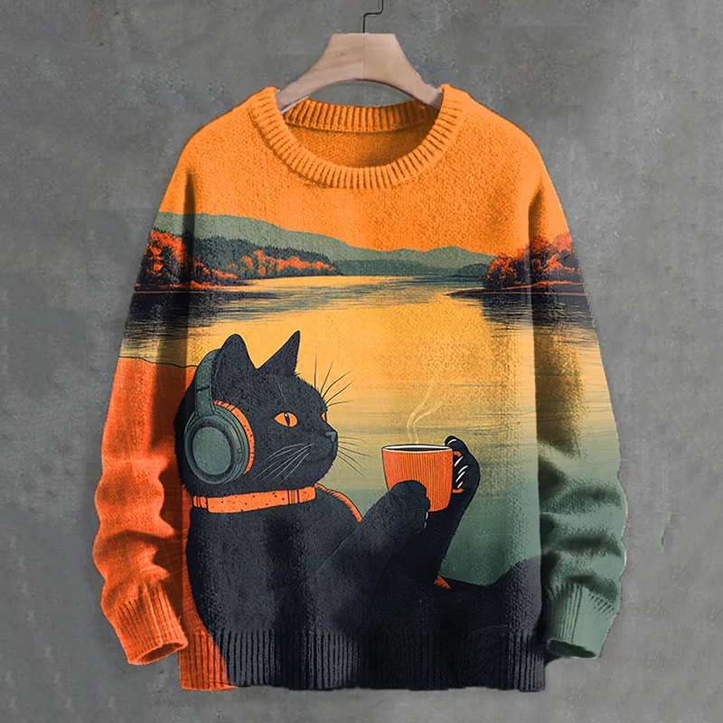 Men's Sunset Black Cat Music Coffee Nature Japanese Art Print Knit Crew Neck Sweater