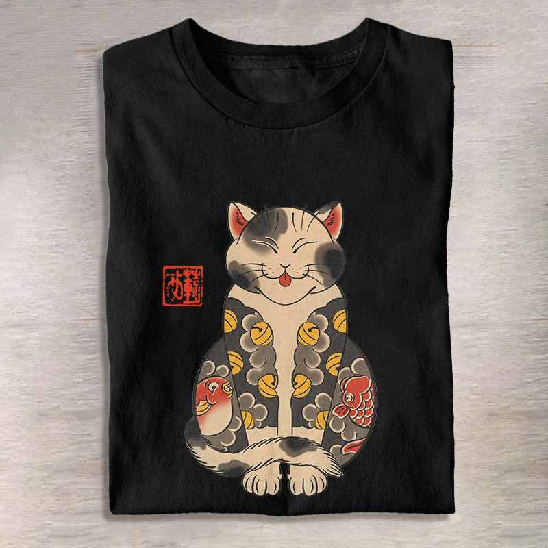 Cute Japanese Ukiyoe Tattoo Cat Print T-Shirt