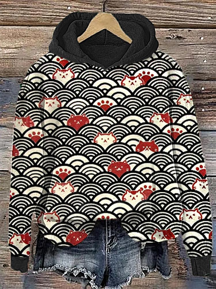 Cat Faces and Waves Japanese Art Print Cotton Cozy Hoodie