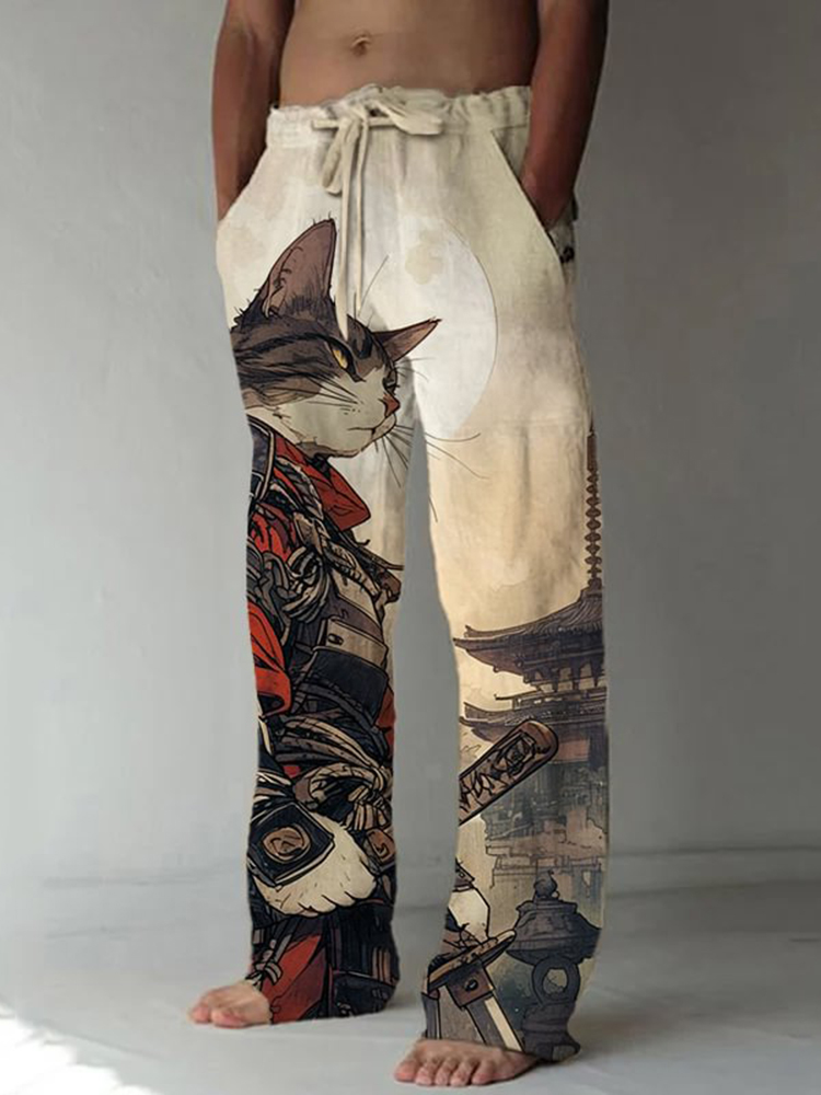 Men's Cat Warrior Guard with Knife Art Print Linen Blend Casual Pants