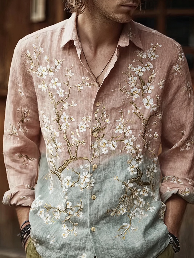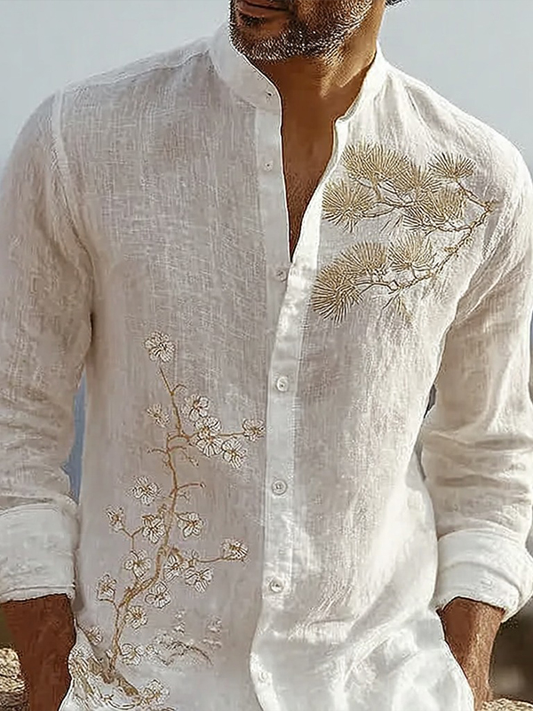 Men's Japanese-style Pine Tree And Cherry Blossom Pattern Linen Blend Shirt