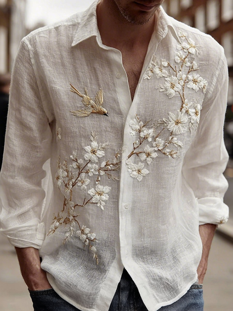 Men's Vintage Floral With Bird Embroidered Art Linen Blend Shirt