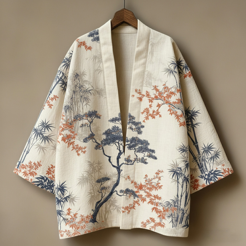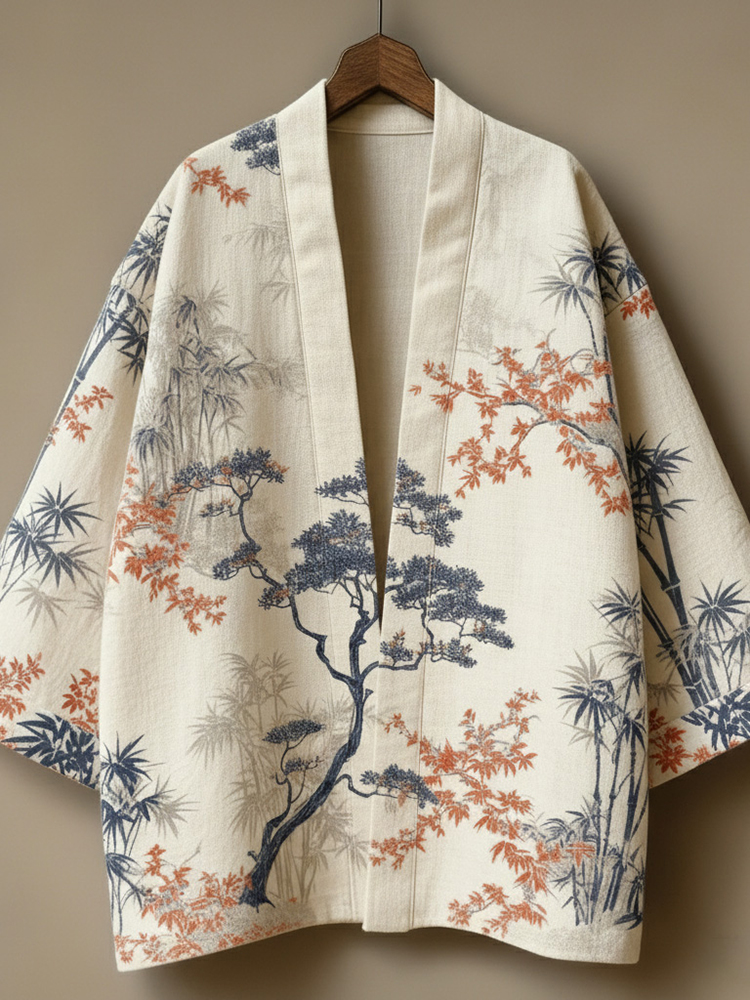 Men's Retro Japanese Tree And Bamboo Print Linen Kimono Cardigan