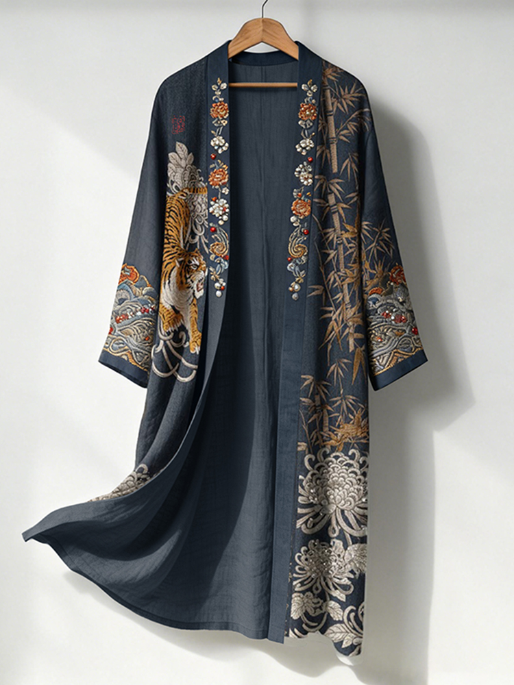 Men's Retro Japanese Tiger And Flowers Art Print Linen Long Kimono