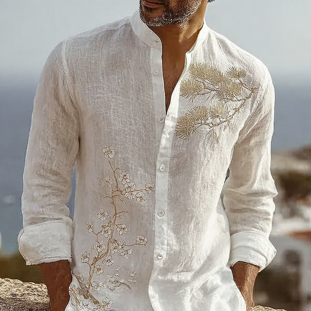 Men's Bohemian Retro Floral Print Long-sleeve Linen Shirt