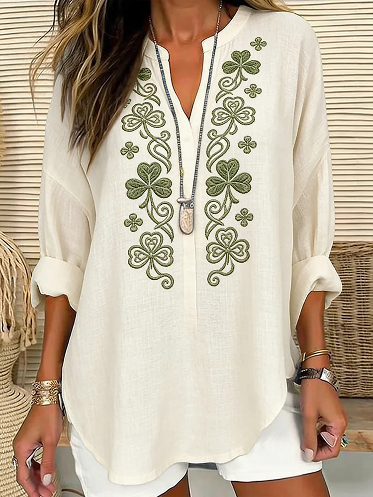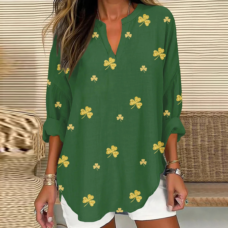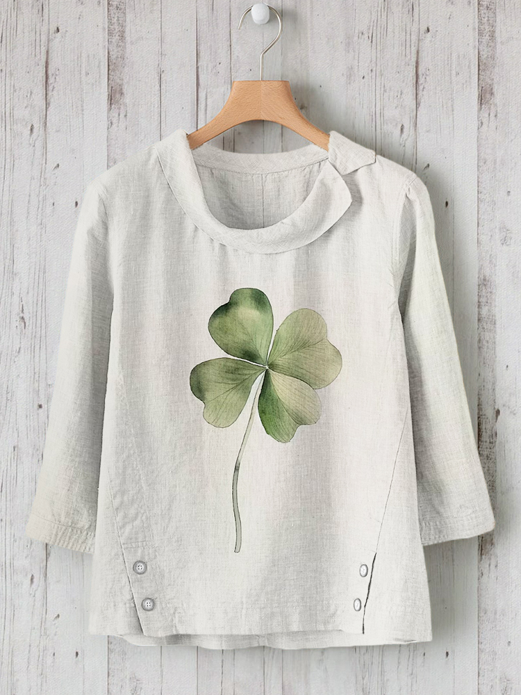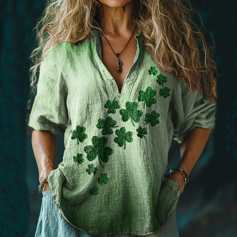 Women's Casual Loose Cotton And Linen St. Patrick's Shamrock Print Shirt