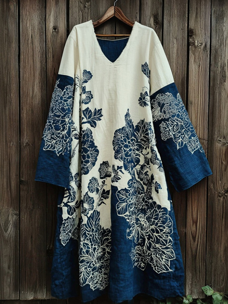 Women's Floral V-neck Long-sleeved Dress