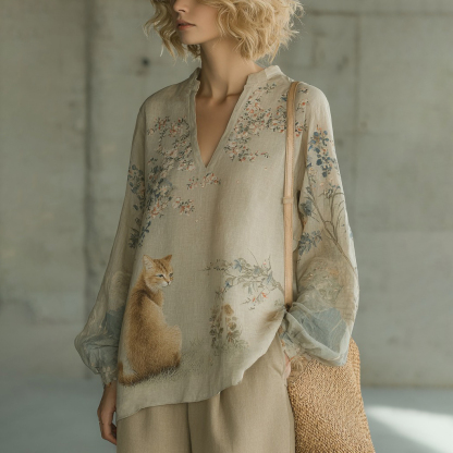 Women's Retro Floral With Cat Print Comfy Top