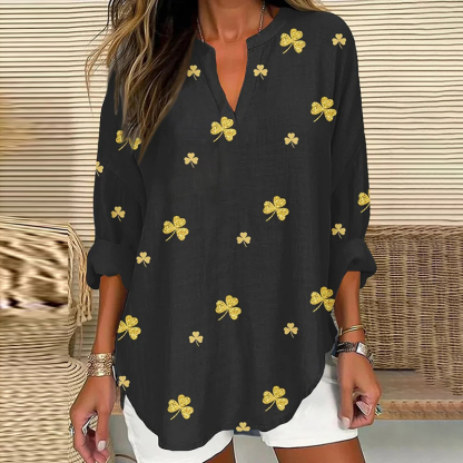 Women's St. Patrick's Shamrock Print V-neck Linen Blend Blouse