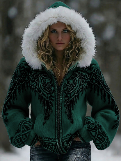 Women's Vintage Viking Celtic Wings Art Zip-up Knit Hooded Sweater